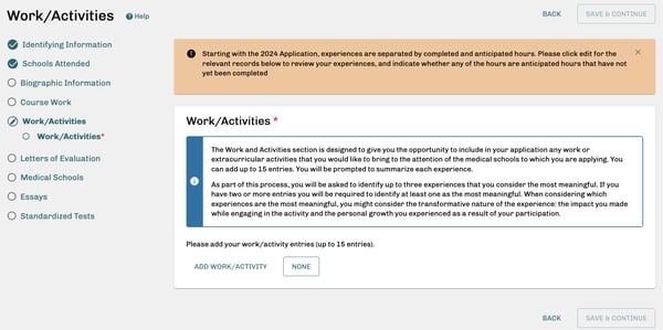 - Start drafting your work and activities descriptions. The Work/Activities section is where you can demonstrate what kind of leader, student, and future physician you are.