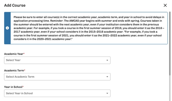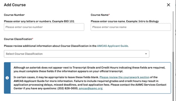 - Delete courses that were added by the AMCAS Verifications team (based on errors or omissions compared to the applicant’s official college transcripts)